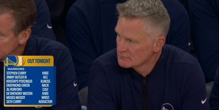 比赛中,转播方晒出了勇士的伤病名单,以下球员今天都不能出战: